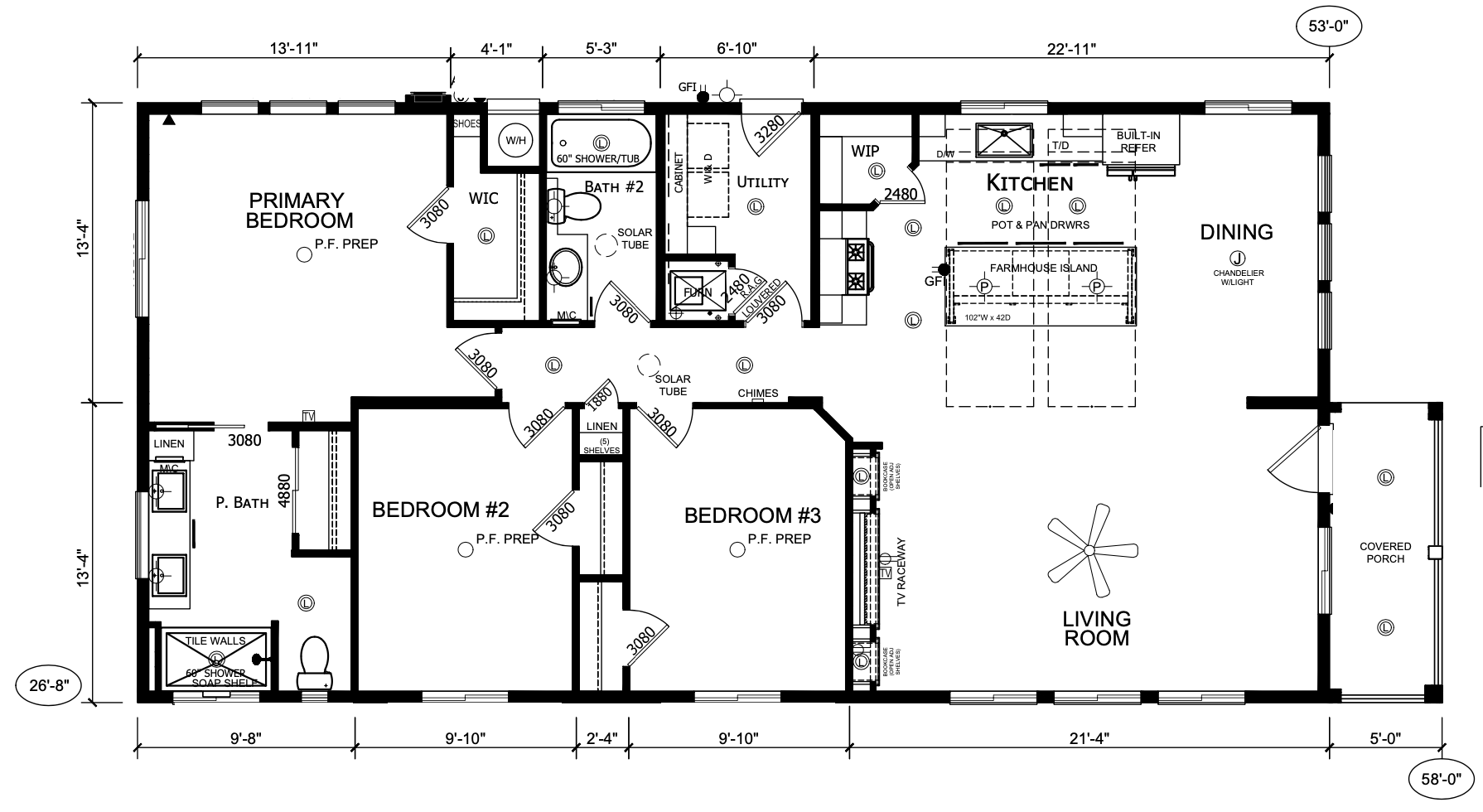 3 bed, 2 bath     1413 Sq.Ft.     26’8″ x 53’/58′